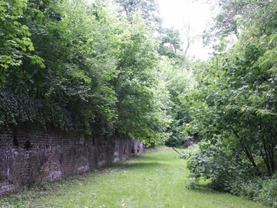 Die beiden Flankengräben und der Frontgraben mit Kontereskarpenmauer sind noch